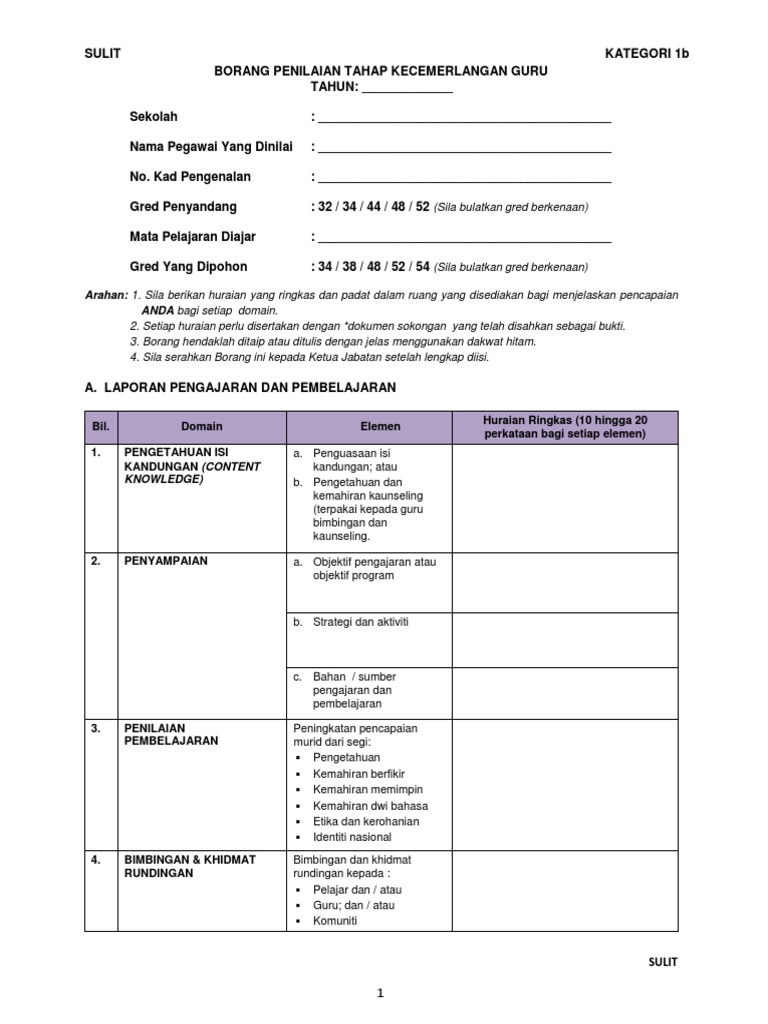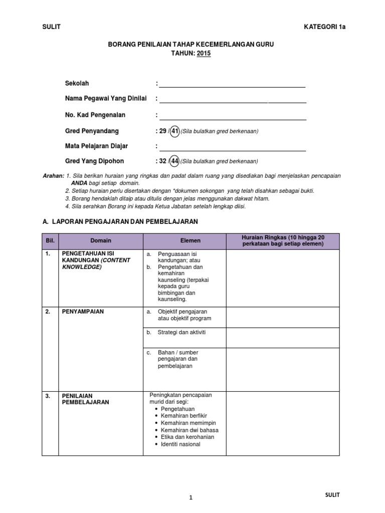 SULIT KATEGORI 1a BORANG PENILAIAN TAHAP KECEMERLANGAN GURU TAHUN. Borang Kategori 1b Guru Docx Sulit Kategori1b Borang Penilaian Tahap Kecemerlangan Guru Tahun 2017 Sekolah Sjk T Ladang Kulai Besar Kulai Course Hero. Guru penolong kanan pendidikan khas.
